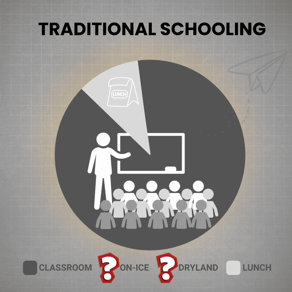 Each day includes approx. 3.5 hours of classroom academics, 1 hour on-ice, 1 hour dryland, and supervised breaks/lunch. The day is designed to maximize both academic focus and hockey performance.